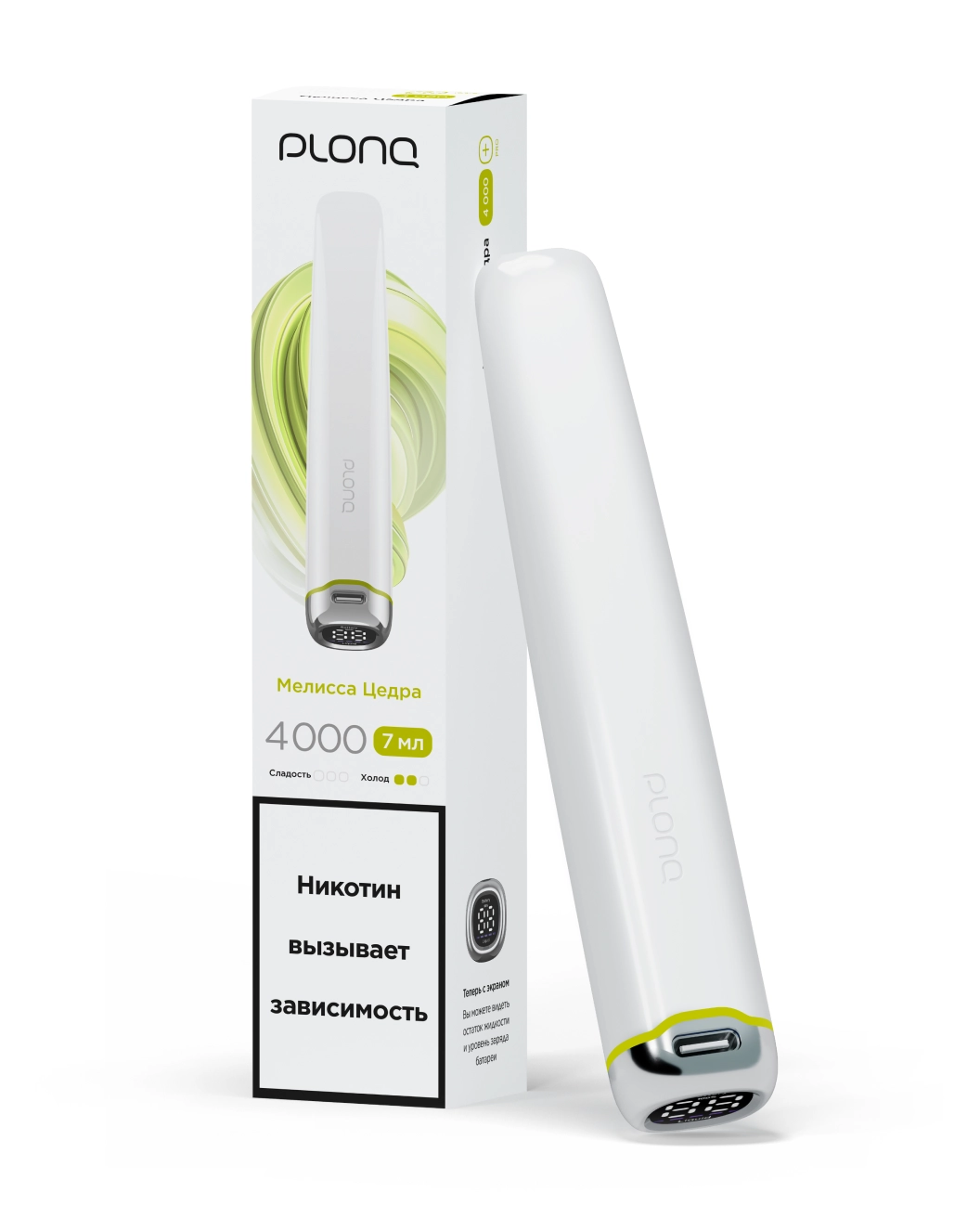 Plonq Plus Pro — электронная сигарета линейки Plus на 4000 затяжек. Устройство оснащено перезаряжаемой батареей и LED-дисплеем, который показывает уровень заряда и уровень жидкости.